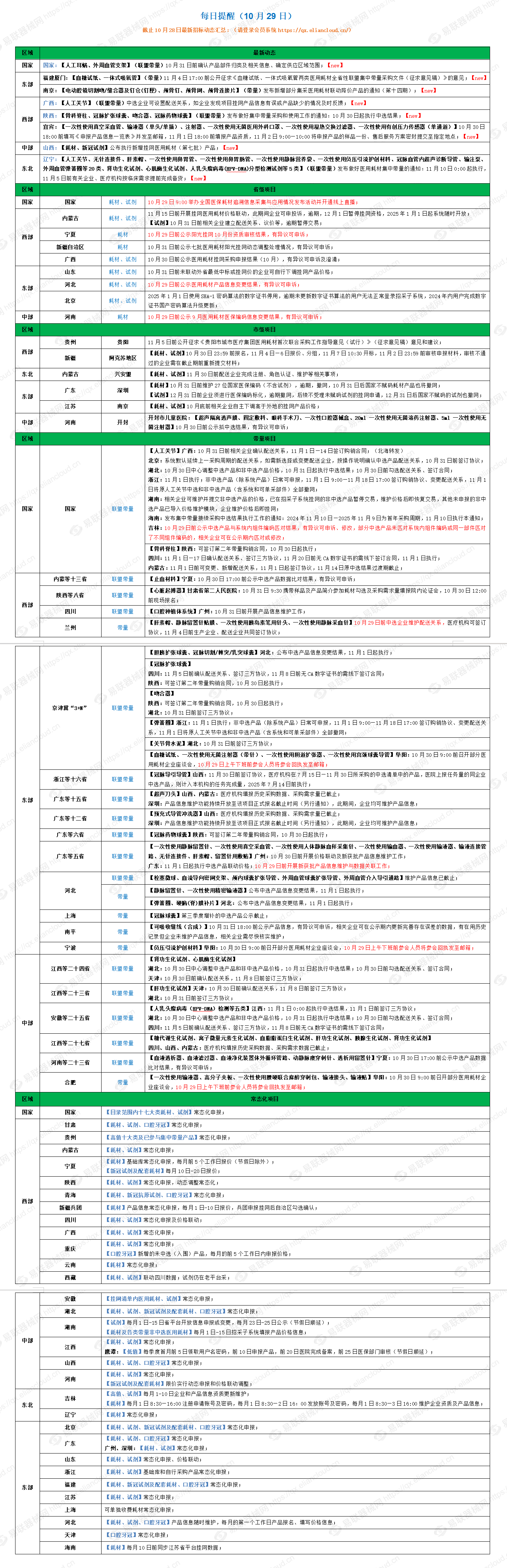 2、国家:【人工耳蜗、外周血管支架】(联盟带量)10月31日前确认产品部件归类及相关信息、确定供应区域范围;